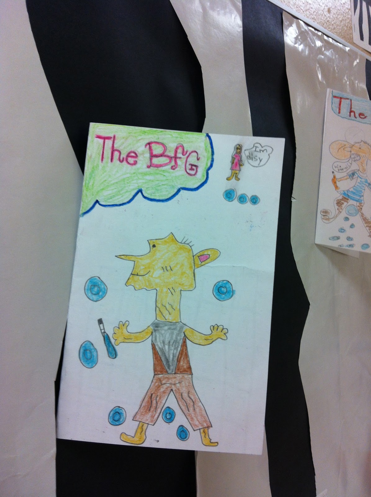 This week has been Literacy Week at my school, our theme has been Wild About Reading and we have had all sorts of fun activities. Monday they had Wild Hair Day (I didn't participate - I spend too much time keeping my hair from getting wild on a daily basis LOL), Tuesday was Animal Print day where we all wore animal print clothes. Yesterday we had a "Book Drill" similar to a fire drill except when the book drill was called everyone stopped what they were doing and began reading, the kids loved it because they got to carry their book around with them all day long. As part of the festivities we are having a "Wild About Reading" themed bulletin board contest. My kids just finished up the book Matilda today (we are watching the movie tomorrow) and we read The BFG before that, so they love Roald Dahl right now. So for our bulletin board we did "We are wild about Roald Dahl books" with a zebra print theme, and I had each student make a "book jacket" for their favorite Roald Dahl book. On the front the had to write the title and a draw a picture of their favorite scene from the book. Then on the inside they had to write about who their favorite character was and why along with a picture of the character and they had to write a description of their favorite part. They LOVED this activity and most of them did an amazing job! I doubt we will win because I have some very creative teammates but the kids really enjoyed it and I like how it turned out. Below are some pictures of the board itself and some closeups of some of the book jackets.